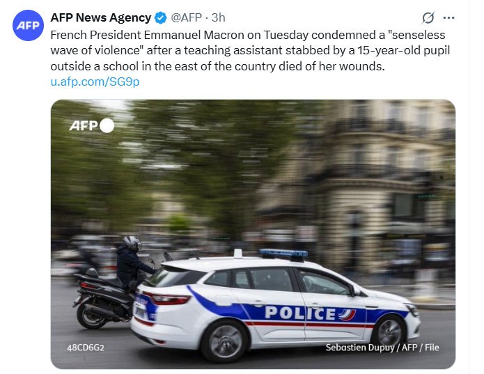 مکرون در X نوشت: «در حالی که از فرزندانمان محافظت میکردیم، یک دستیار آموزشی جان خود را از دست داد و قربانی موج بیمعنی خشونت شد.»