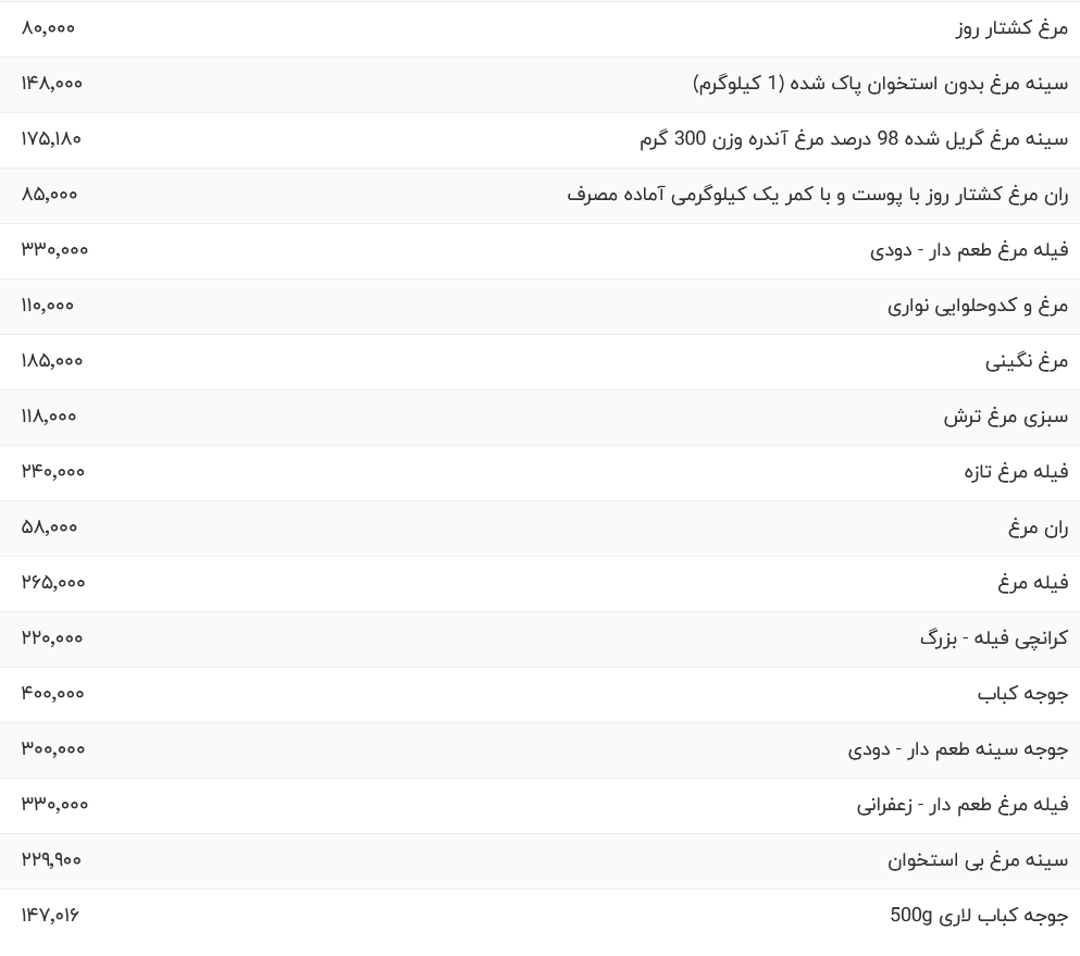 قیمت گوشت مرغ، امروز ۲۵ خرداد ۱۴۰۴ شامل ران مرغ، مرغ زنده، مرغ بدون استخوان، فیله مرغ، پا مرغ، مرغ کشتار روز، ران مرغ با پوست، مرغ ترش و مرغ سبز اعلام شد.