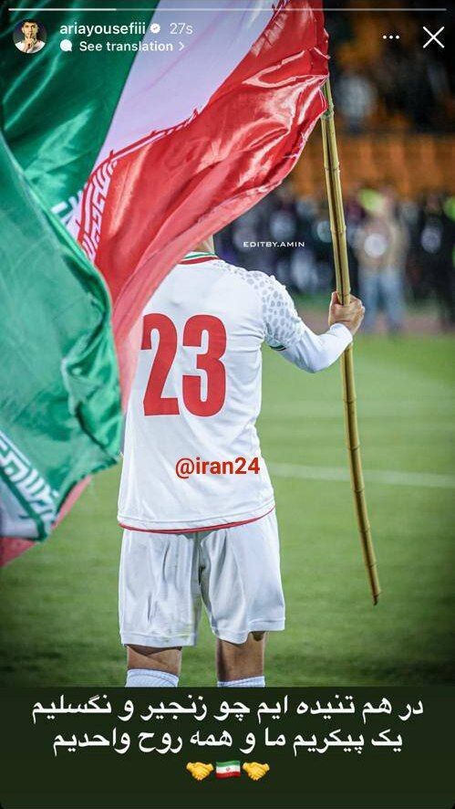 آریا یوسفی، ستاره مطرح تیم ملی و باشگاه سپاهان در واکنش به جنایات رژیم صهیونیستی یک استوری اینستاگرامی با تصویری در کنار پرچم کشور منتشر کرده و نوشته است: در هم تنیده‌ایم چو زنجیر و نگسلیم؛ یک پیکریم ما و همه روح واحدیم.