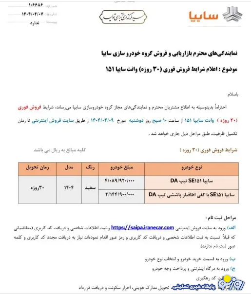 روزنو :شرایط فروش خودرو سایپا ۱۵۱ ویژه ۹ تیر ۱۴۰۴ اعلام شد.