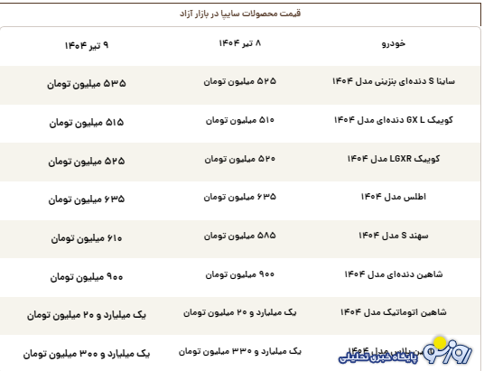 قیمت روز محصولات سایپا دوشنبه ۹ تیر