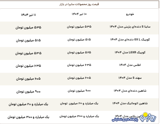 قیمت روز محصولات سایپا چهارشنبه ۱۱ تیر