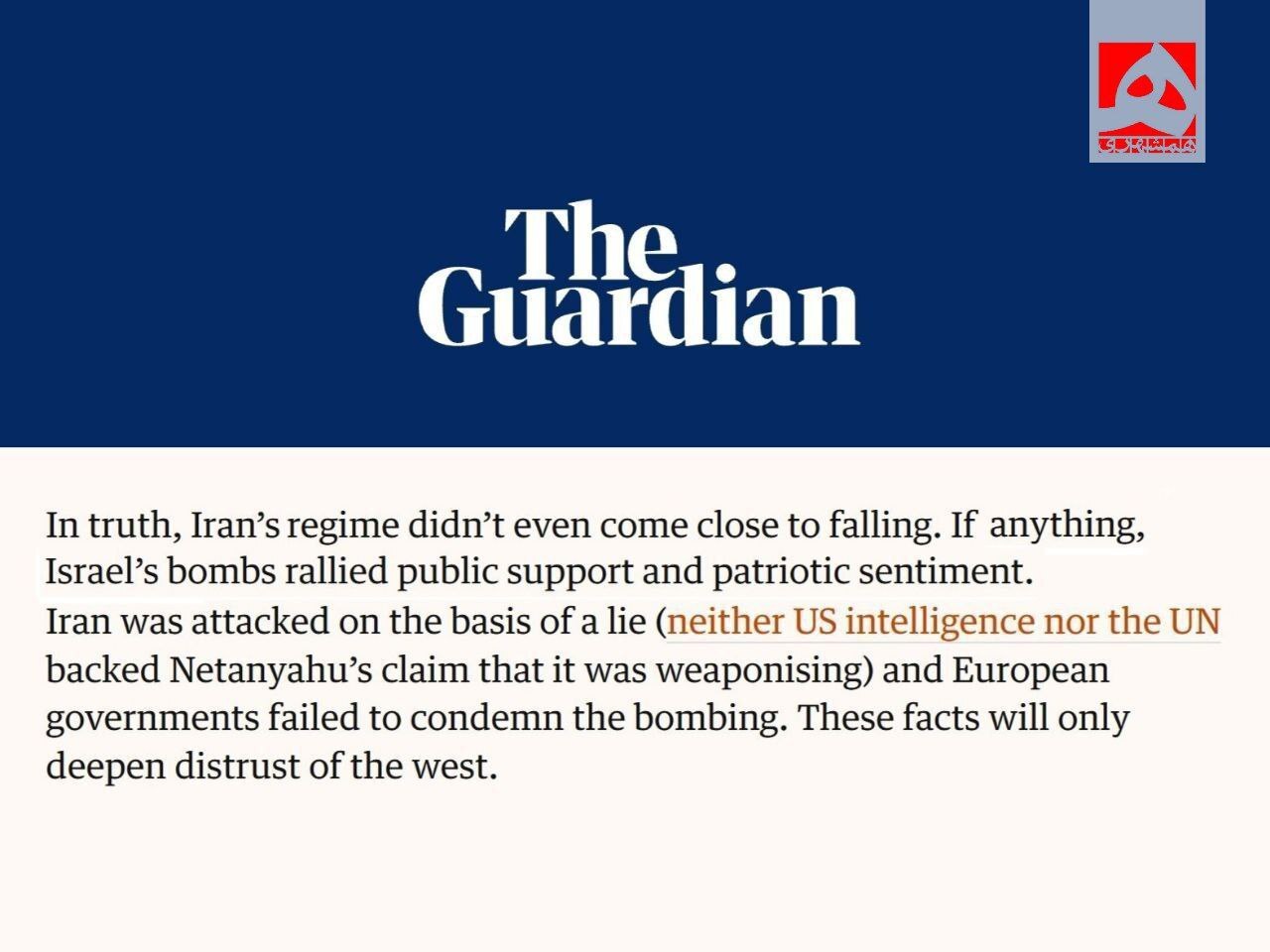 همشهری آنلاین: روزنامه انگلیسی گاردین نوشته است: ایران بر پایه یک دروغ مورد حمله قرار گرفت: اینکه ایران داشت برنامه هستهای خود را به یک برنامه نظامی تبدیل میکرد. ادعایی که نه سازمانهای اطلاعاتی آمریکا و نه سازمان ملل آن را تأیید نمیکردند؛ ولی با این حال، دولتهای اروپایی حاضر نشدند که بمباران ایران را محکوم کنند. این واقعیات فقط بیاعتمادی به غرب را عمیقتر میکند.