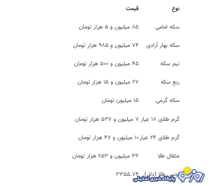 گزارشها حاکی از آن است که هر قطعه سکه امامی با افزایش ۲ میلیون و ۱۰ تومانی، ۸۵ میلیون و ۵ هزار تومان شد.