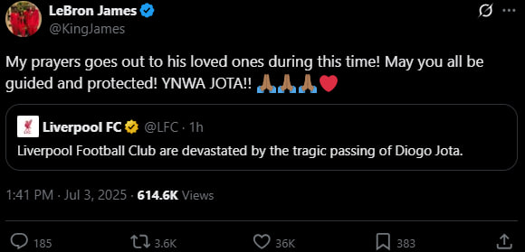 طرفداری: لبران جیمز هم به درگذشت دیوگو ژوتا واکنش نشان داد. دنیای فوتبال صبح امروز، پس از شنیدن خبر درگذشت دیوگو ژوتا در غم و اندوه فرو رفت. لبران جیمز، اسطوره دنیای بسکتبال که از هواداران و سهامداران خرد لیورپول هم به حساب میآید، با انتشار یک متن در X به درگذشت مهاجم پرتغالی این باشگاه واکنش نشان داد: در این لحظات برای عزیزان او دعا میکنم. امیدوارم که همه شما در پناه خداوند، هدایت و حفاظت شوید. تو هرگز تنها قدم نخواهی زد، ژوتا!