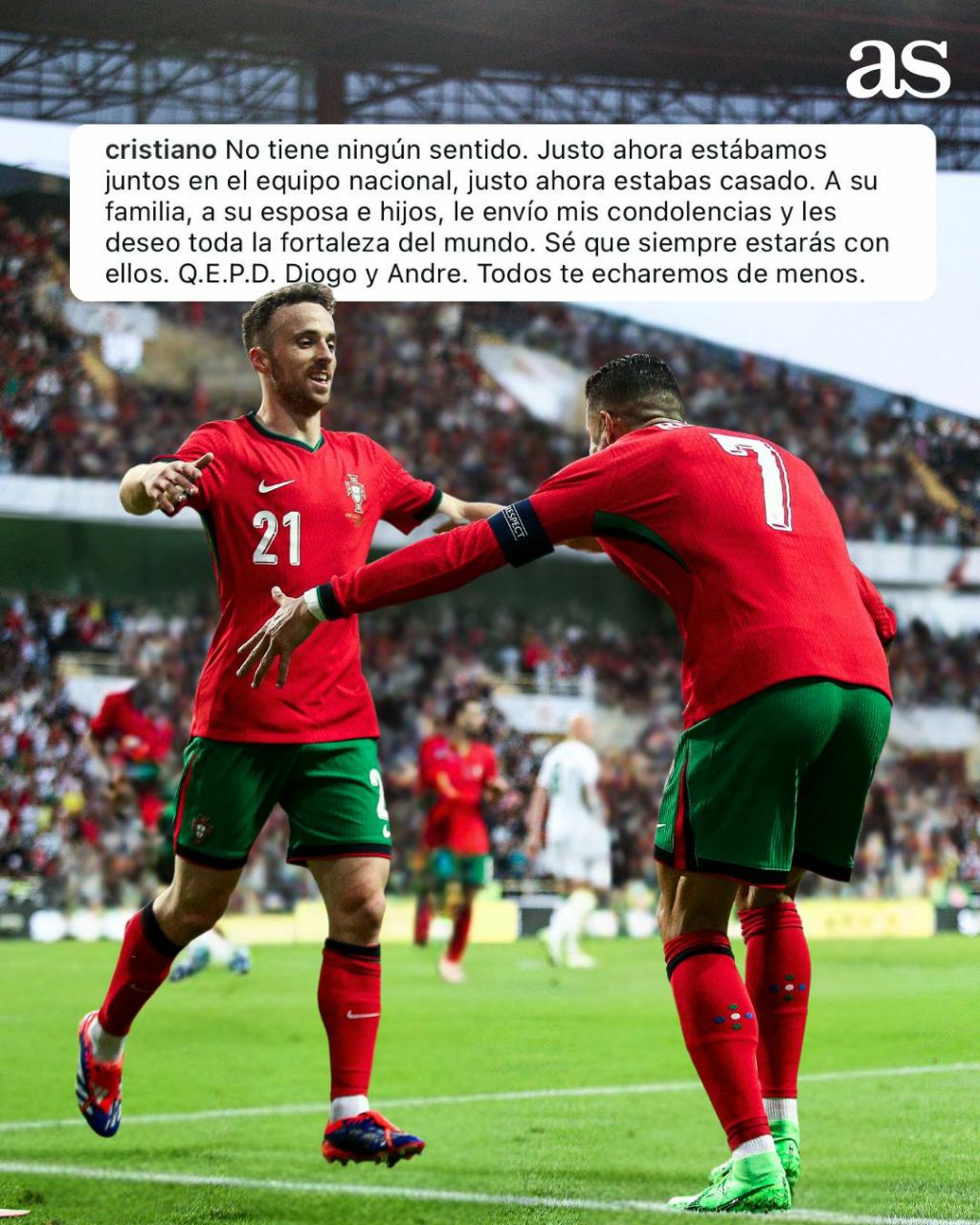 کریستیانو رونالدو، کاپیتان تیم ملی پرتغال به خبر درگذشت دیوگو ژوتا بر اثر سانحه رانندگی در اسپانیا واکنش نشان داد. رونالدو با انتشار پستی در اینستاگرام نوشت: این منطقی نیست... همین چند وقت پیش با هم در تیم ملی بودیم، به تازگی ازدواج کرده بودی. به خانوادهات، همسرت و فرزندانت تسلیت میگویم و برایشان آرزوی صبر و قدرت دارم. میدانم که همیشه کنارشان خواهی بود. روحت شاد دیوگو ژوتا، دلتنگت خواهیم شد.