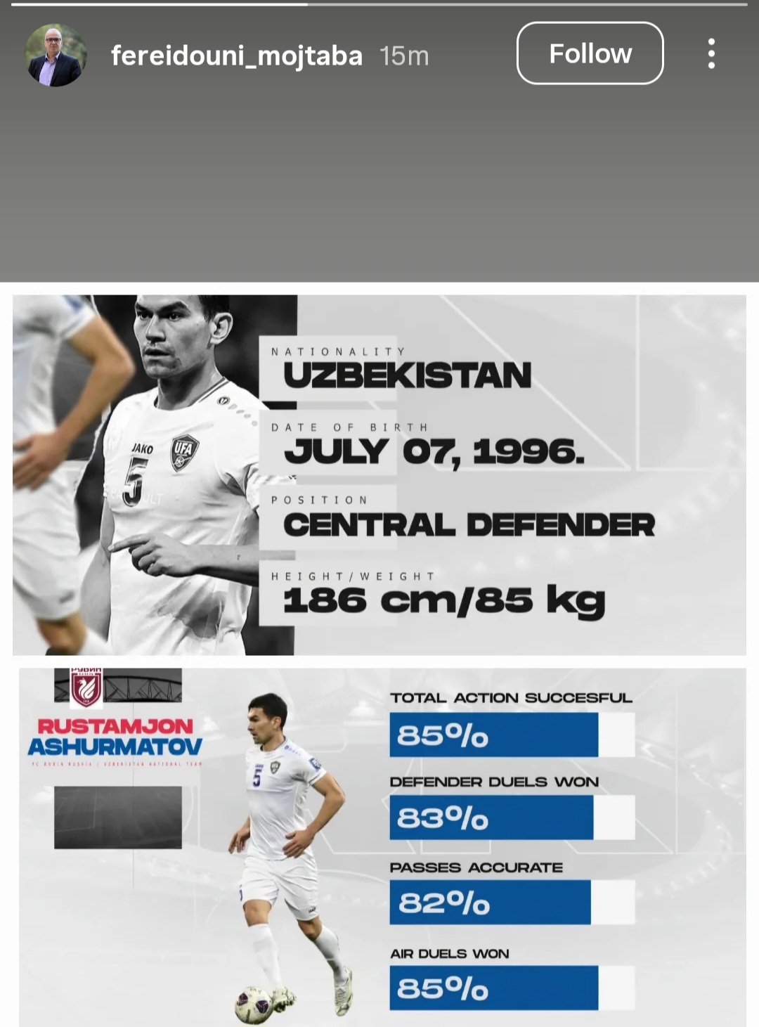 برترین‌ها: مجتبی فریدونی، عضو هیات مدیره باشگاه استقلال با انتشار یک استوری که شامل آمارفنی رستم آشورماتوف مدافع تیم ملی ازبکستان است، به صورت غیرمستقیم قطعی شدن خرید این بازیکن را اعلام کرد.