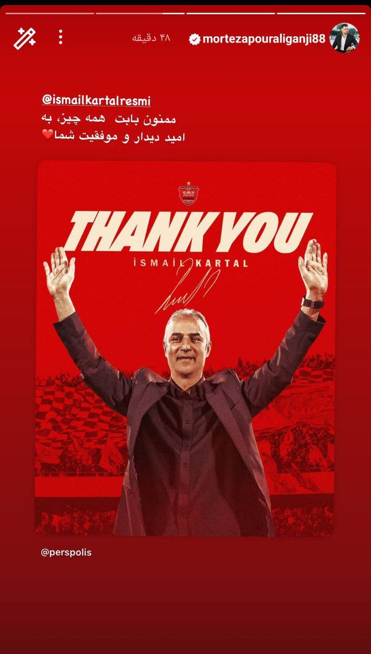 این مدافع پرسپولیس ابتدا در پیامی از زحمات اسماعیل کارتال در کادرفنی تقدیر و تشکر کرد و پس از آن نیز با پیامی ویژه به وحید هاشمیان و حضورش به عنوان سرمربی جدید سرخ ها خوشامد گفت.