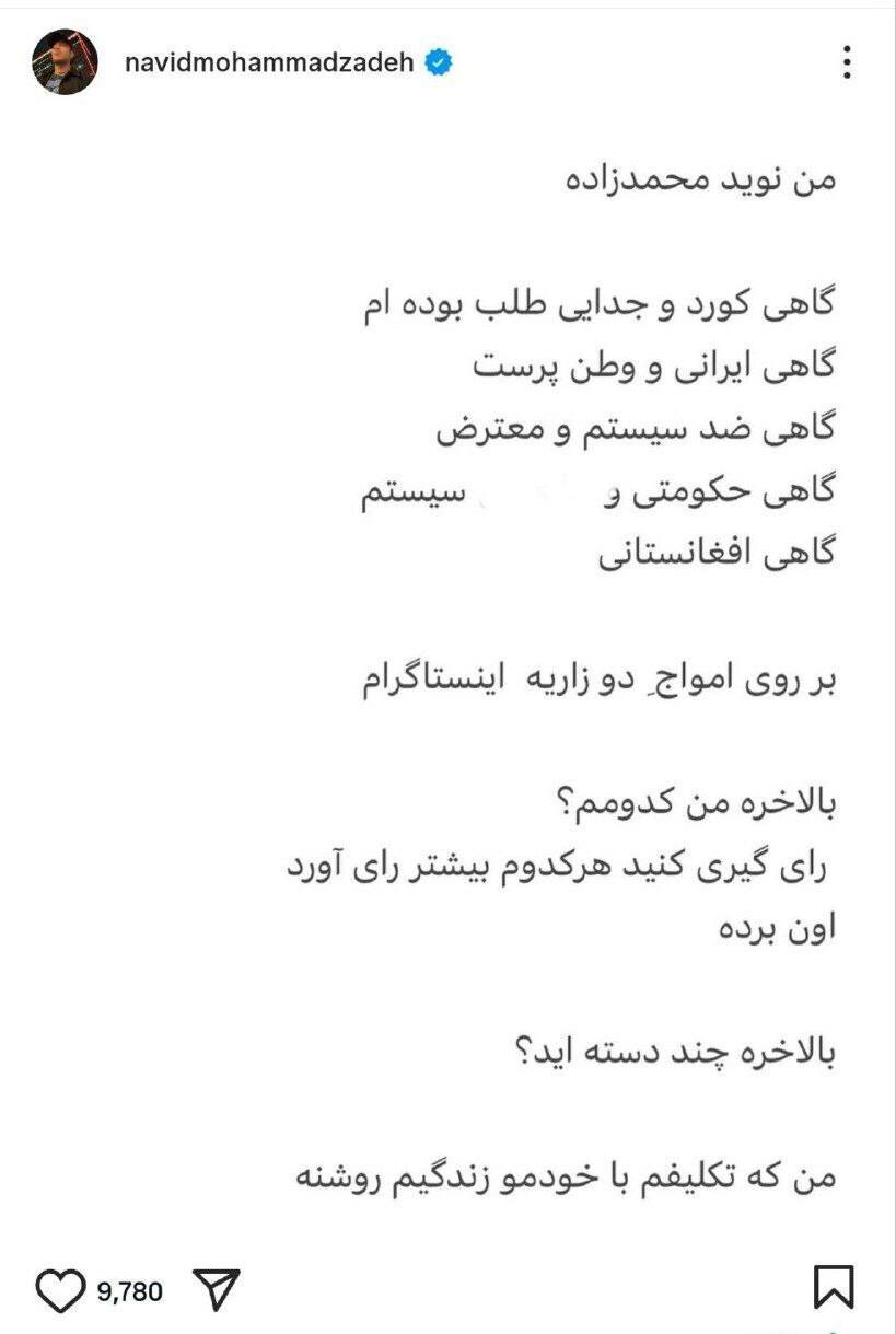 نوید محمدزاده، بازیگر سینما و تئاتر در صفحه اینستاگرام خود نوشت: «گاهی ایرانی و وطن پرست بودهام، گاهی افغانستانی، گاهی معترض و گاهی جدایی طلب، بر روی امواج دو زاریه اینستاگرام. بالاخره من کدومم؟ رای گیری کنید هر کدوم بیشتر رای آورد اون برده. بالاخره چند دستهاید؟»