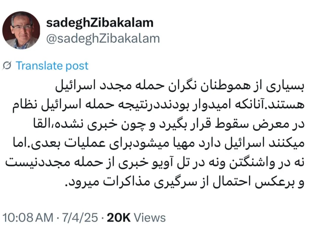 صادق زیباکلام در حساب شخصی خود در شبکه ایکس نوشت: بسیاری از هموطنان نگران حمله مجدد اسرائیل هستند. آنانکه امیدوار بودند درنتیجه حمله اسرائیل نظام در معرض سقوط قرار بگیرد و چون خبری نشده، القا میکنند اسرائیل دارد مهیا میشودبرای عملیات بعدی. اما نه در واشنگتن و نه در تل آویو خبری از حمله مجدد نیست و برعکس احتمال از سرگیری مذاکرات میرود.