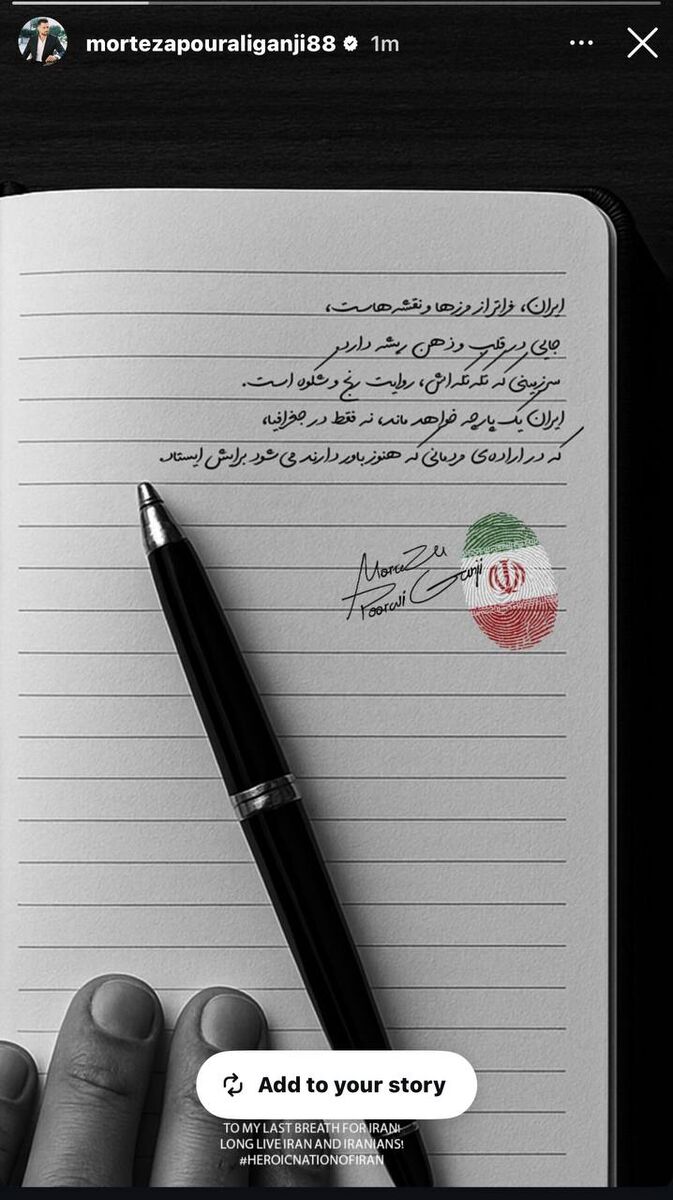 حالا مرتضی پورعلی گنجی، ستاره خط دفاع پرسپولیس با انتشار یک استوری اینستاگرامی نوشته است: ایران، فراتر از مرزها و نقشههاست، جایی در قلب و ذهن ریشه دارد و سرزمینی که تکه تکهاش، روایت رنج و شکوه است. ایران یکپارچه خواهد ماند، نه فقط در جغرافیا، که در ارادهی مردمانی که هنوز باور دارند میشود برایش ایستاد.