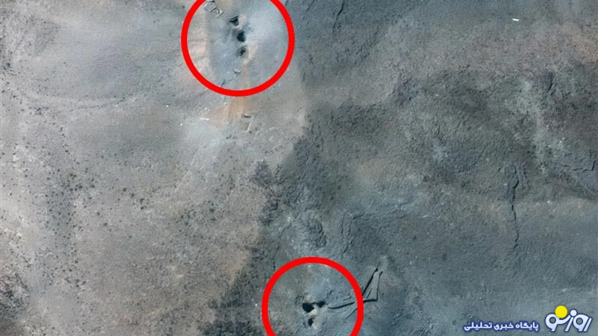 تصویر ماهواره‌ای که دو خوشه سوراخ در سایت هسته‌ای فردو در ایران را پس از حملات ایالات متحده نشان می‌دهد