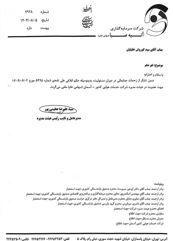 هیات مدیره شرکت هواپیمایی آسمان صبح امروز کوروش خلیلیان، مدیرعامل این شرکت را از سمت خود برکنار و محمد حیدری شالی را به عنوان سرپرست این شرکت معرفی کرد.