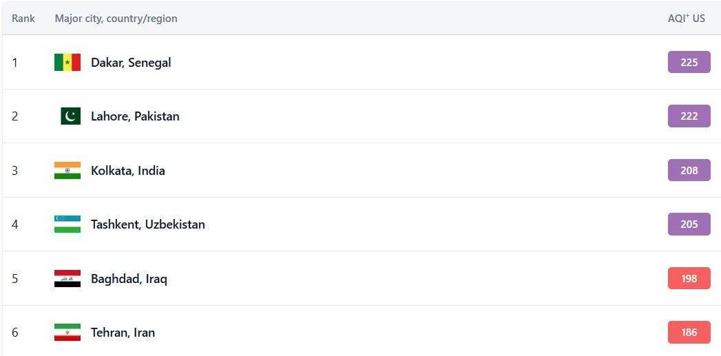 روزنو :براساس تازهترین دادههای منتشرشده در وبسایت IQAir، تهران با ثبت شاخص آلودگی ۲۰۳ در وضعیت «بسیار ناسالم» قرار گرفته و در حال حاضر ششمین شهر آلوده جهان است. این رتبهبندی بهصورت زنده بهروزرسانی میشود و تهران در کنار شهرهایی قرار گرفته که هر ساله در صدر فهرست آلودهترین نقاط جهان دیده میشوند.