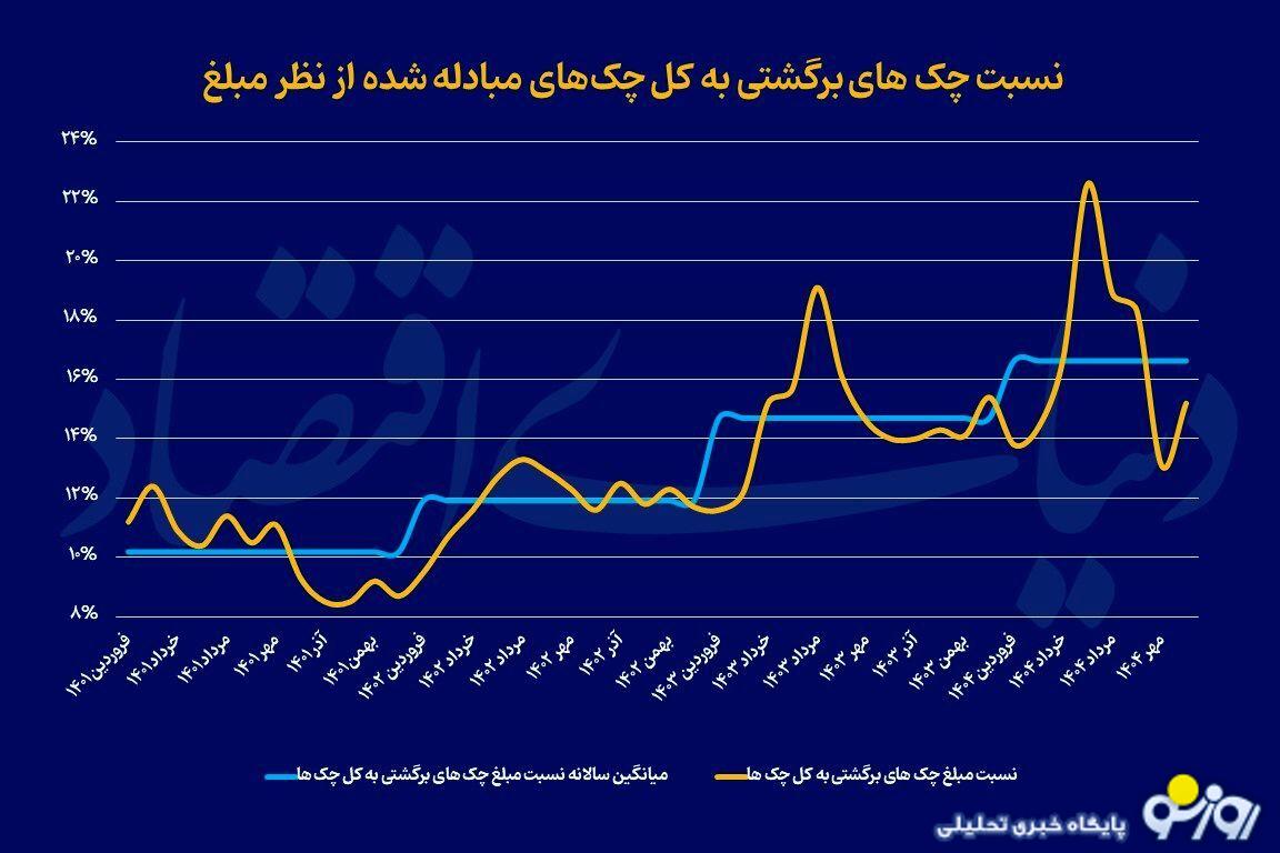 بررسی‌ها نشان می‌دهد در ماه‌های بعد از جنگ ۱۲ روزه، نسبت مبلغ چک‌های برگشتی به کل چک‌ها حتی تا بیش از ۲۲ درصد نیز رسیده است. این رقم از آبان سال ۱۳۹۶ تاکنون بی‌سابقه بوده است. به طور کلی، در سه‌ماه تابستان سال جاری، نسبت مبلغ چک‌های برگشت خورده به مبلغ کل چک‌های مبادله شده به ترتیب ۲۲.۶ درصد در تیر ماه، ۱۸.۹ در مرداد ماه و ۱۸.۳ در شهریور ماه بوده است. از نظر تعداد نیز تابستان سال جاری بالاترین نسبت تعداد چک‌های برگشتی را به ثبت رسانده است. به طوری که در تیر ماه ۱۴.۵ درصد از کل چک‌های مبادله شده برگشت خورده، که از فروردین ماه سال ۱۳۹۹ تاکنون بی‌سابقه است. در دو ماه دیگر تابستان سال جاری نیز رقم نسبت چک‌های برگشتی به کل چک‌ها از نظر تعداد ارقام بالایی به ثبت رسیده است. به طوری که در دو ماه مرداد و شهریور، به ترتیب ۱۲ و ۱۲.۲ درصد از چک‌های مبادله شده برگشت خورده است.