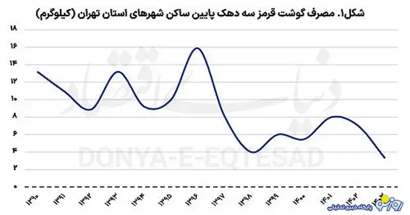 در یک کار پژوهشی، با استفاده از داده‌های بودجه خانوار مرکز آمار ایران، تغییر مصرف سه دهک پایین شهر‌های استان تهران بررسی شد. نتایج بررسی آماری حاکی از آن است که از سال۱۳۹۰ تا سال۱۴۰۳ مصرف کالا‌های پرکالری نظیر لبنیات، گوشت قرمز و برنج روند کاهشی را تجربه کرده و از سال۱۳۹۷ مصرف این اقلام به‌طور میانگین ۵۰ درصد افت داشته است. اما در مقابل مصرف نان که ارزان و کم‌کالری است، به شکل قابل توجهی افزایش یافته است.