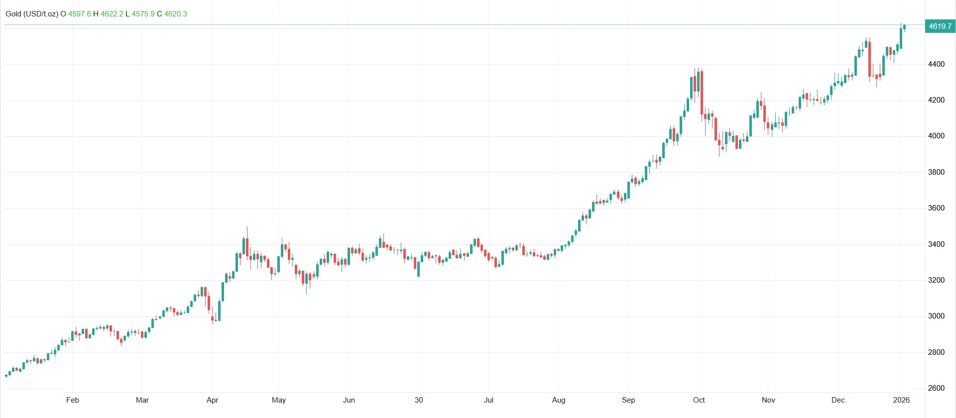 در شامگاه روز سهشنبه ۲۳ دی ماه ۱۴۰۴ برابر با ۱۳ ژانویه ۲۰۲۶ پس از اینکه دادههای تورم آمریکا نگرانیها درباره فشارهای قیمتی مجدد را کاهش داد قیمت طلای جهانی در حالی در بالاترین سطوح تاریخی خود و در نزدیکی ۴،۶۲۰ دلار در هر اونس داد و ستد میشود که در جریان معاملات روز جاری توانسته با رشد نزدیک به یک درصدی و افزایش بیش از ۴۴ دلاری نسبت به معاملات پایانی روز گذشته سقف تاریخی ۴۶۲۲ دلار و ۲۰ سنت را ثبت کند.