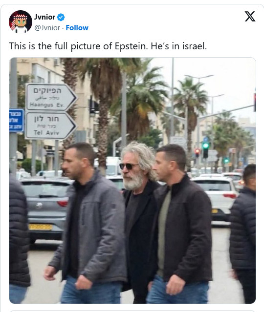 صفحه‌ای به نام «MonitorX» با بیش از ۱۰۰ هزار دنبال‌کننده نیز ادعا کرده است: «تصاویری که در اسرائیل گرفته شده، فردی شبیه جفری اپستین را نشان می‌دهد که با آرایش و همراه با دو محافظ دیده می‌شود؛ تصاویری که در شبکه‌های اجتماعی به‌سرعت در حال انتشار است.»