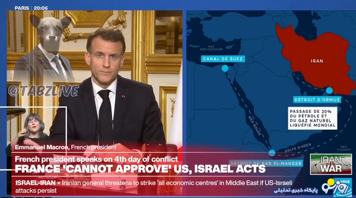 امانوئل مکرون، رئیس جمهور فرانسه: تنگه هرمز بسته است و ۲۰ درصد گاز طبیعی مایع و بنزین تجارت شده در جهان از آنجا عبور می‌کند. کانال سوئز نیز در معرض تهدید است.