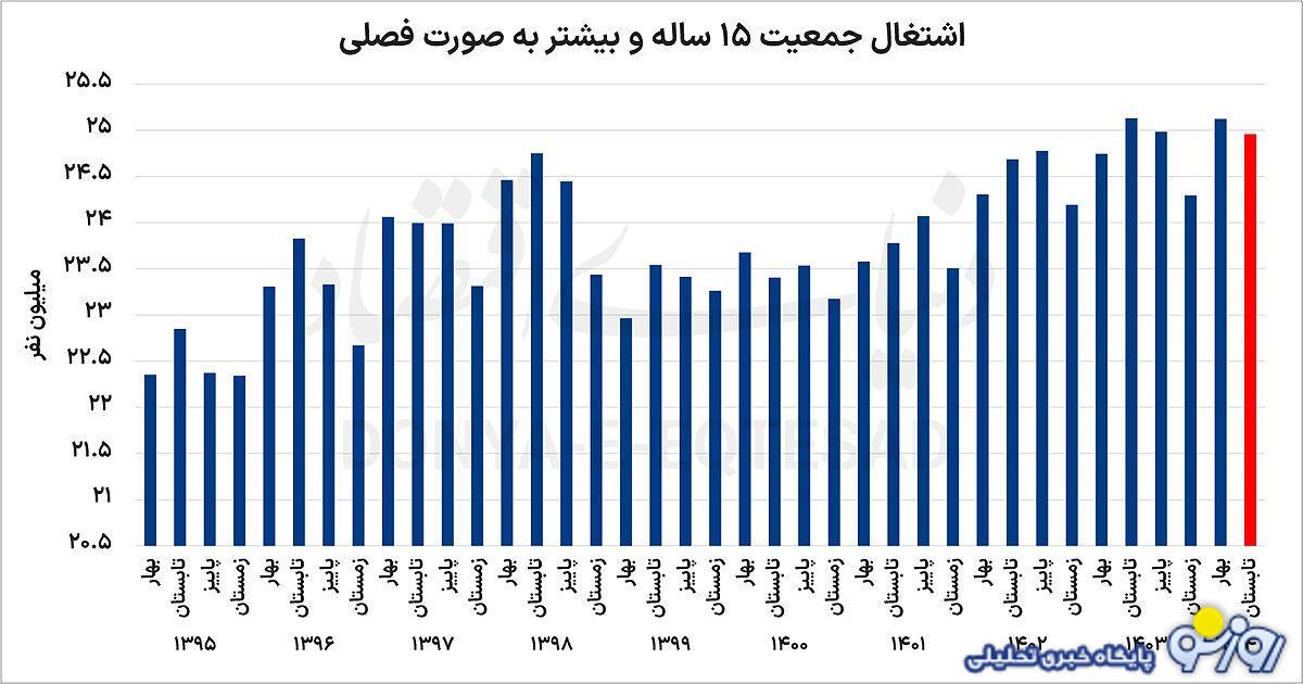 از سوی دیگر بررسی تعداد شاغلان در تابستان ۱۴۰۴ تصویر دیگری از وضعیت بازار کار ارائه میدهد. بر اساس دادههای منتشر شده، جمعیت شاغل ۱۵ساله و بیشتر در این فصل بالغ بر ۲۴میلیون و ۹۵۸ هزار نفر بوده است. این رقم نه تنها نسبت به فصل بهار کاهش یافته بلکه در مقایسه با تابستان سال ۱۴۰۳ نیز افت نشان میدهد. برآوردها حاکی از آن است که تعداد شاغلان در تابستان ۱۴۰۴ نسبت به تابستان سال پیش حدود ۱۷۰ هزار نفر کاهش پیدا کرده است. این در حالی است که در سالهای گذشته روند اشتغال در فصل تابستان معمولا افزایشی بوده است. کاهش تعداد شاغلان در تابستان ۱۴۰۴ از این نظر قابلتوجه است که با الگوی معمول سالهای گذشته تفاوت دارد. بر اساس برخی برآوردها که پیش از این نیز «دنیای اقتصاد» به آن پرداخته بود، جنگ ۱۲روزه در تابستان ۱۴۰۴ به کاهش اشتغال حدود ۴۵۰هزار نفری منجر شده است.