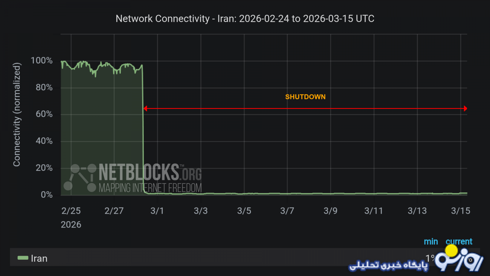 در پایان این بازه زمانی، در تاریخ ۱۵ مارس (روز گذشته یکشنبه ۲۴ اسفند)، میزان اتصال بهطور ناگهانی تقریباً به صفر سقوط میکند. نمودار زیر، وضعیت سطح دسترسی اینترنت از روز ۲۰ فوریه ۲۰۲۶ (حدود یک هفته قبل از آغاز جنگ) تا ۱۵ مارس ۲۰۲۶ (دیروز یکشنبه ۲۴ اسفند) را نشان میدهد.