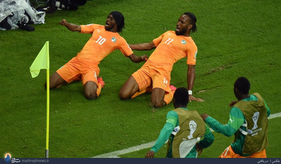 خوشحالی دیدیه دروگبا و ژروینهو دو مهاجم ساحل عاج پس از زدن گل دوم به ژاپن. ساحل عاج این بازی را 2-1 از ژاپن برد.