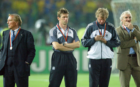 تیم ملی آلمان تاکنون (پیش از جام‌جهانی 2014) هفت بار در دیدار پایانی جام‌های جهانی حاضر شده که بیش از هر تیم ملی فوتبال بوده است. ژرمن‌ها آخرین بار در سال 2002 و جام جهانی به میزبانی کره و ژاپن به دیدار نهایی رسیدند که با شکست دو بر صفر برابر برزیل از رسیدن به چهارمین عنوان قهرمانی جهان بازمانده و آخرین قهرمانی ژرمن‌ها همان عنوان سال 1990 ایتالیا است. نایب قهرمانی آلمان در خاور دور در حالی رقم خورد که هدایت‌شان را رودی فولر بر عهده داشت. در کادر دستیاران او افراد آشنایی حضور داشتند ولی یک نام برای هواداران فوتبال در ایران شناخته‌شده‌تر به نظر می‌رسد. اریش روته‌مولر که زمانی به عنوان مدرس فوتبال پایش به فوتبال ایران باز شد در نهایت این فرصت را یافت تا دستیار علی دایی در نیمکت تیم ملی هم باشد. او یک فصل را هم به عنوان مربی با آبی‌پوشان تهرانی سر کرد و در نهایت از فوتبال ایران رفت. روته‌مولر روزگاری نه چندان دور رئیس کمیته آموزش فدراسیون فوتبال آلمان نیز بود برای یک بازی و البته به صورت موقت سرمربی تیم ملی ایران شد که مردانش آن بازی را با تساوی به پایان رساندند. عکس زیر اریش روته‌مولر را با نشان نقره جام جهانی 2002 نشان می‌دهد؛ زمانی که با میشائیل اسکیبه هدایت اولیور کان و میشائیل بالاک را بر عهده داشتند و در نهایت برابر مردان فلیپه اسکولاری و ستارگانی چون رونالدو، رونالدینیو، ریوالدو و کافو کاری از پیش نبرده و نایب قهرمان جهان شدند.