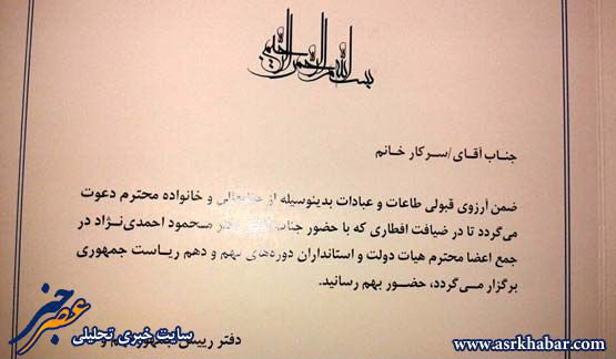تصویر زیر، کارت دعوت از مهمانان برای حضور در ضیافت افطاری محمود احمدینژاد را نشان میدهد.