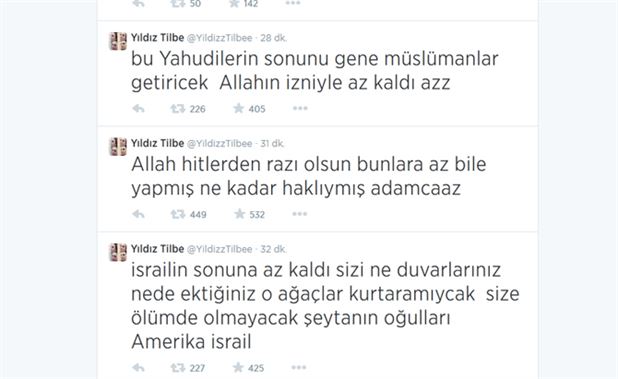 به گزارش خبرگزاری فرانسه، نوشت: "ییلدیز تیلبه" خواننده 47 ساله پاپ ترکیه ، در واکنش به حملات اسراییل علیه غزه در صفحه توییتر خود نوشت: به یاری خدا پایان اسراییل نزدیک است.